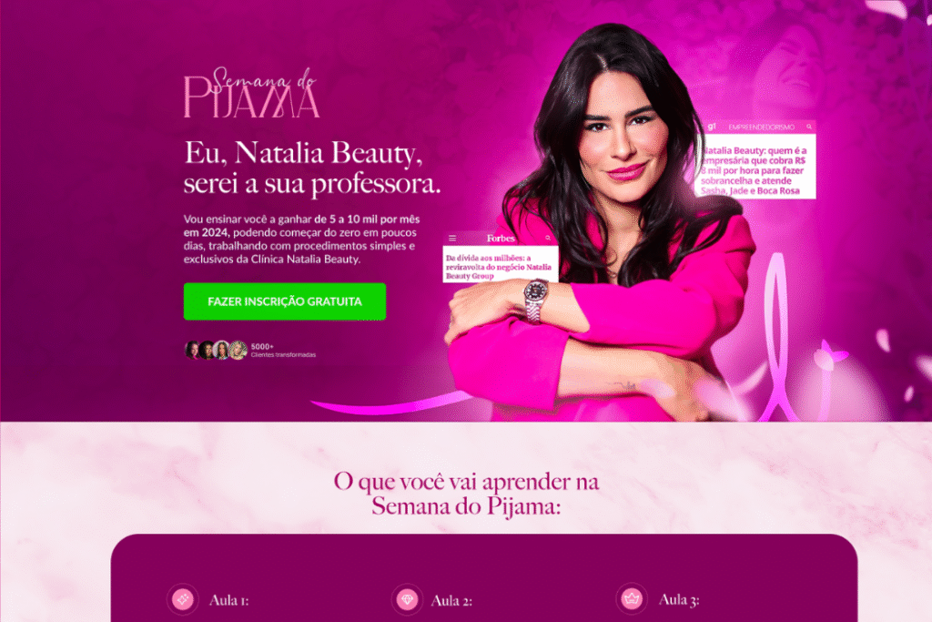 Landing page criada para captar alunas interessadas no evento gratuito profissional da Natália Beauty.